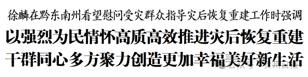 7月7日至8日,省委书记徐麟到黔东南州从江县、榕江县、凯里市、雷山县看望慰问受灾群众,调研指导灾后恢复重建工作。他强调,要深入学习贯彻习近平总书记关于防汛救灾工作的重要指示和考察贵州重要讲话精神,以强烈为民情怀高质高效推进灾后恢复重建,干群同心多方聚力创造更加幸福美好新生活。省领导郭锡文、李建、孙发参加。